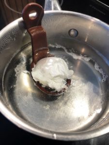 Si vous avez des cuillère à pocher, déposer l’œuf dedans et plonger de tout dans l’eau.