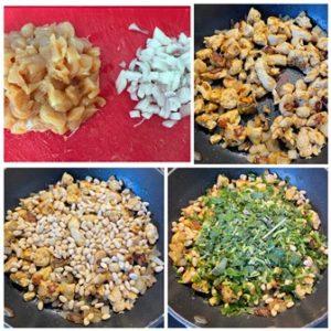 Ici je l’ai associé à une farce de poulet et pignons de pin avec laquelle j’ai farci des poivrons.