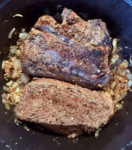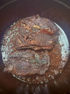 Il s’agit d’un morceau de bœuf que l’on fait dorer à la cocotte puis cuire au four à l’étouffée très lentement à basse température avec des oignons et du sucre pour le confire.