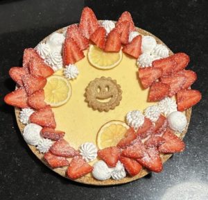 Lorsque la crème citron a bien figée, décorer la tarte en disposant quelques pointes de meringues et en intercalant quelques morceaux de fraises et de fines rondelles de citron.