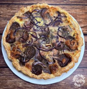 Une pâte feuilletée, des betteraves, de la mozzarella et des oignons rouges le tout lié avec un simple appareil à quiche.