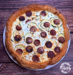 Sur une pâte feuilletée, des courgettes, un appareil à quiche à base de ricotta et basilic et des rondelles de chorizo pour apporter du piquant.